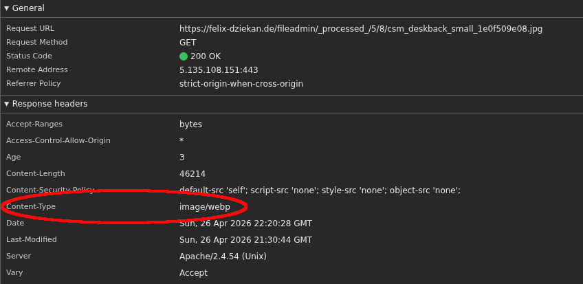 curl -sI -H "Accept: image/webp,*/*" felix-dziekan.de | grep -i "content-type\|vary"