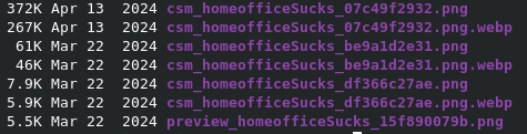 The WebP files exist on disk. But Apache doesn't know to use them yet. The HTML still says src="image.png" and Apache obediently serves the PNG.