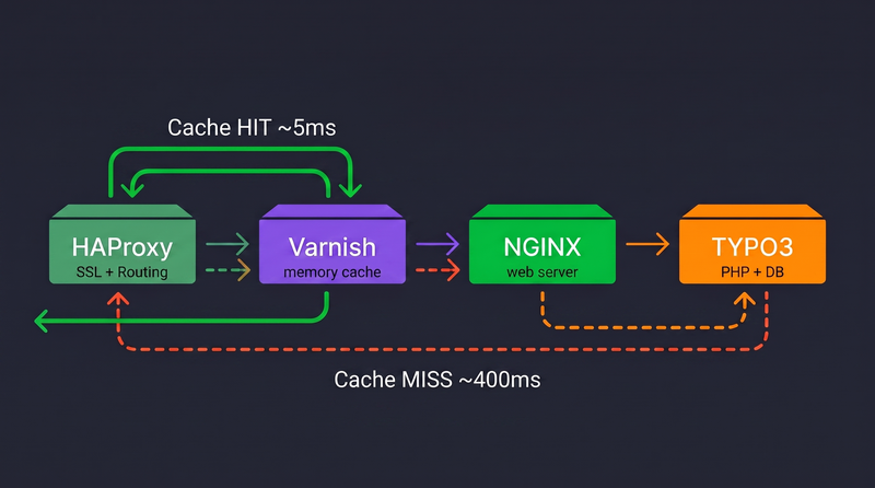 HAProxy sits at the very front of the stack. It handles SSL termination with Let's Encrypt certificates and decides — based on hostname and path — where each request goes. Not everything needs to go through Varnish. The TYPO3 backend, for example, should never be cached.